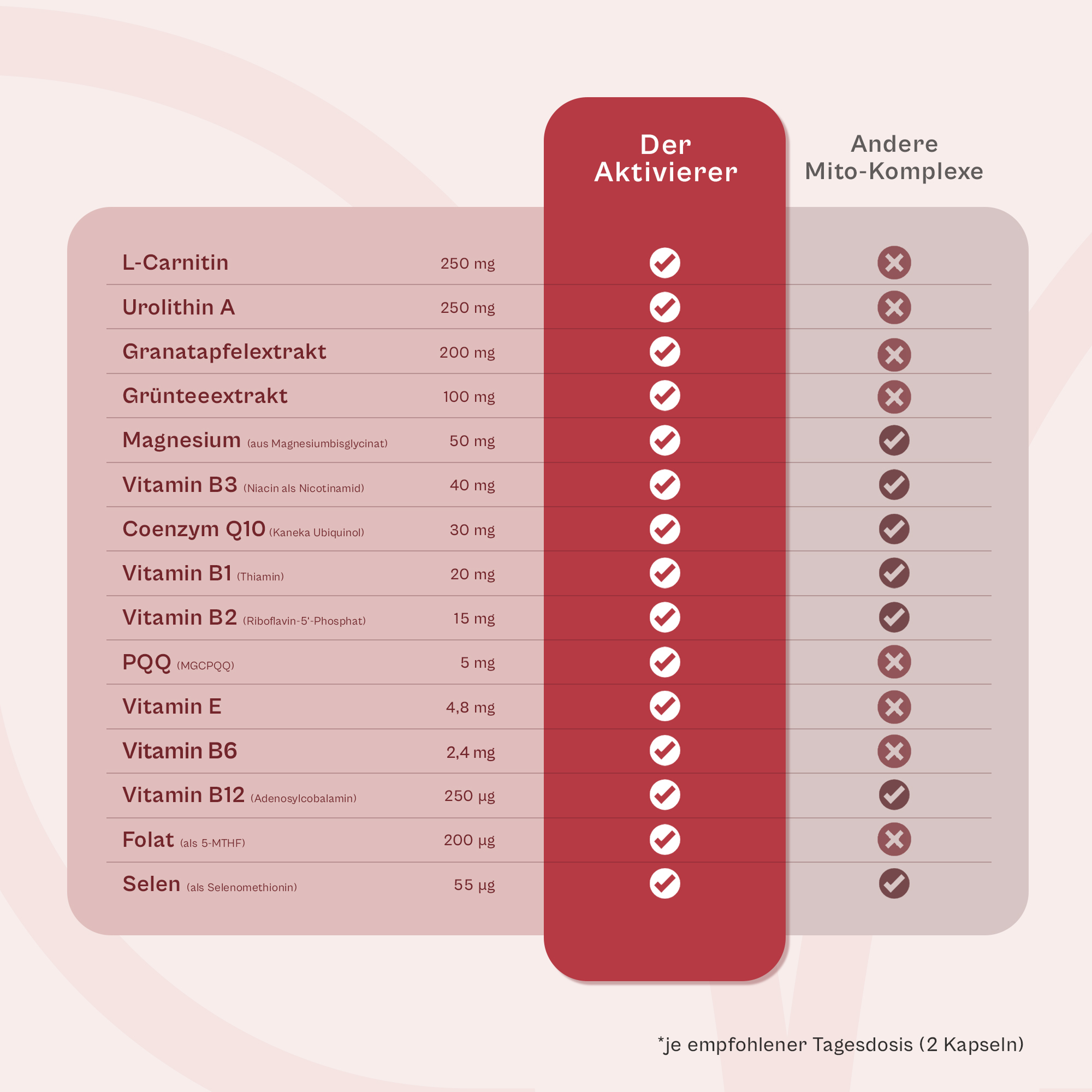 Der Aktivierer unterstützt dich dort, wo Energie entsteht: im Energiestoffwechsel. B-Vitamine und Magnesium tragen zu einem normalen Energiestoffwechsel bei, Magnesium sowie ausgewählte B-Vitamine zudem zur Verringerung von Müdigkeit und Ermüdung. Vitamin E und Selen tragen dazu bei, die Zellen vor oxidativem Stress zu schützen – ergänzt durch eine durchdachte Formel aus Q10 (Ubiquinol), L-Carnitin, Urolithin A, PQQ und Pflanzenextrakten, damit du nicht mehrere Einzelprodukte kombinieren musst.