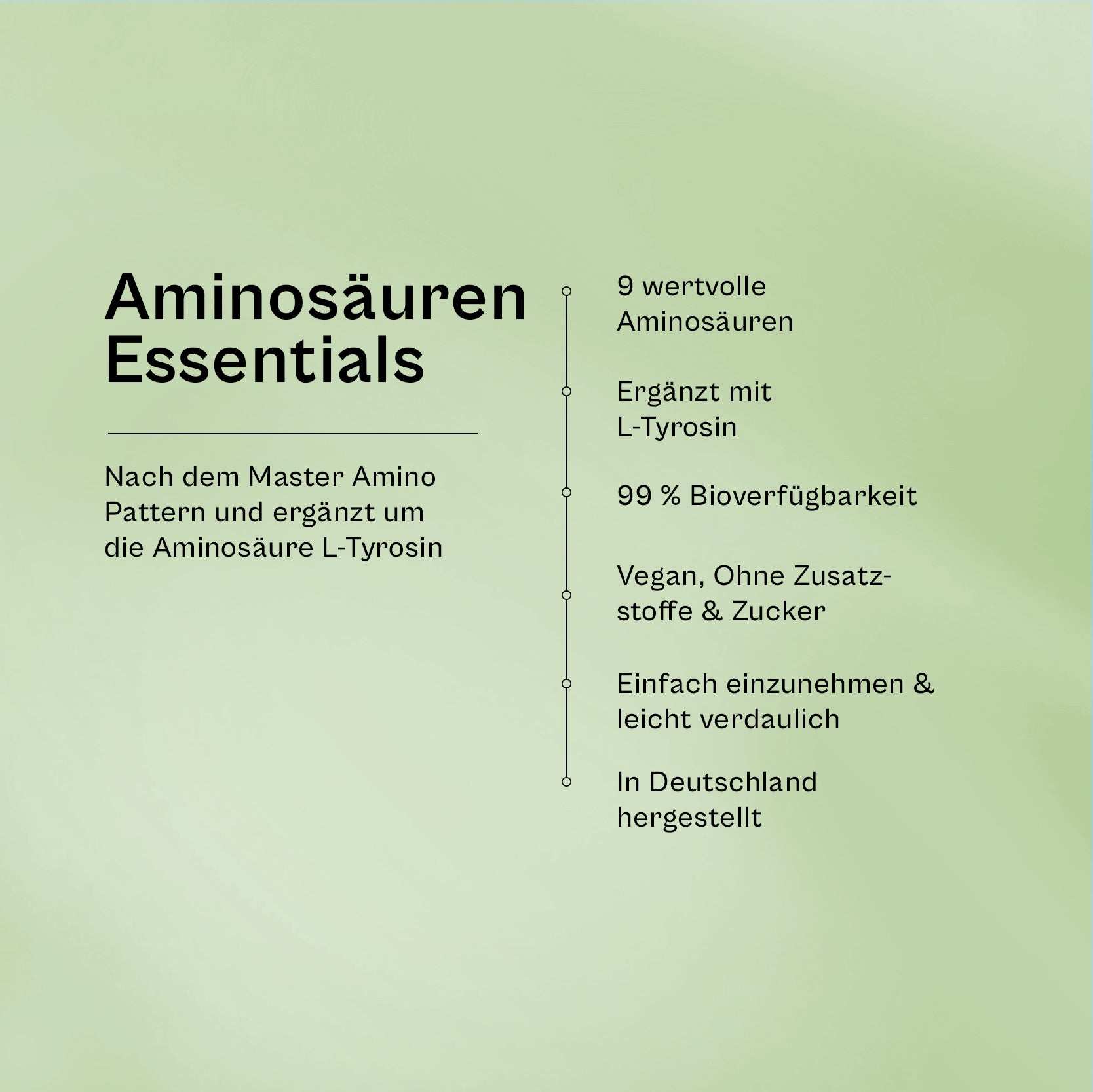 Dein Körper kann sie nicht selbst herstellen, du musst sie über die Nahrung aufnehmen. Unsere Formel enthält alle acht essentiellen Aminosäuren in einem ausgewogenen Verhältnis, ergänzt um L-Tyrosin als semi-essentielle Aminosäure. Als Presslinge lassen sie sich unabhängig von der Tageszeit flexibel einnehmen.