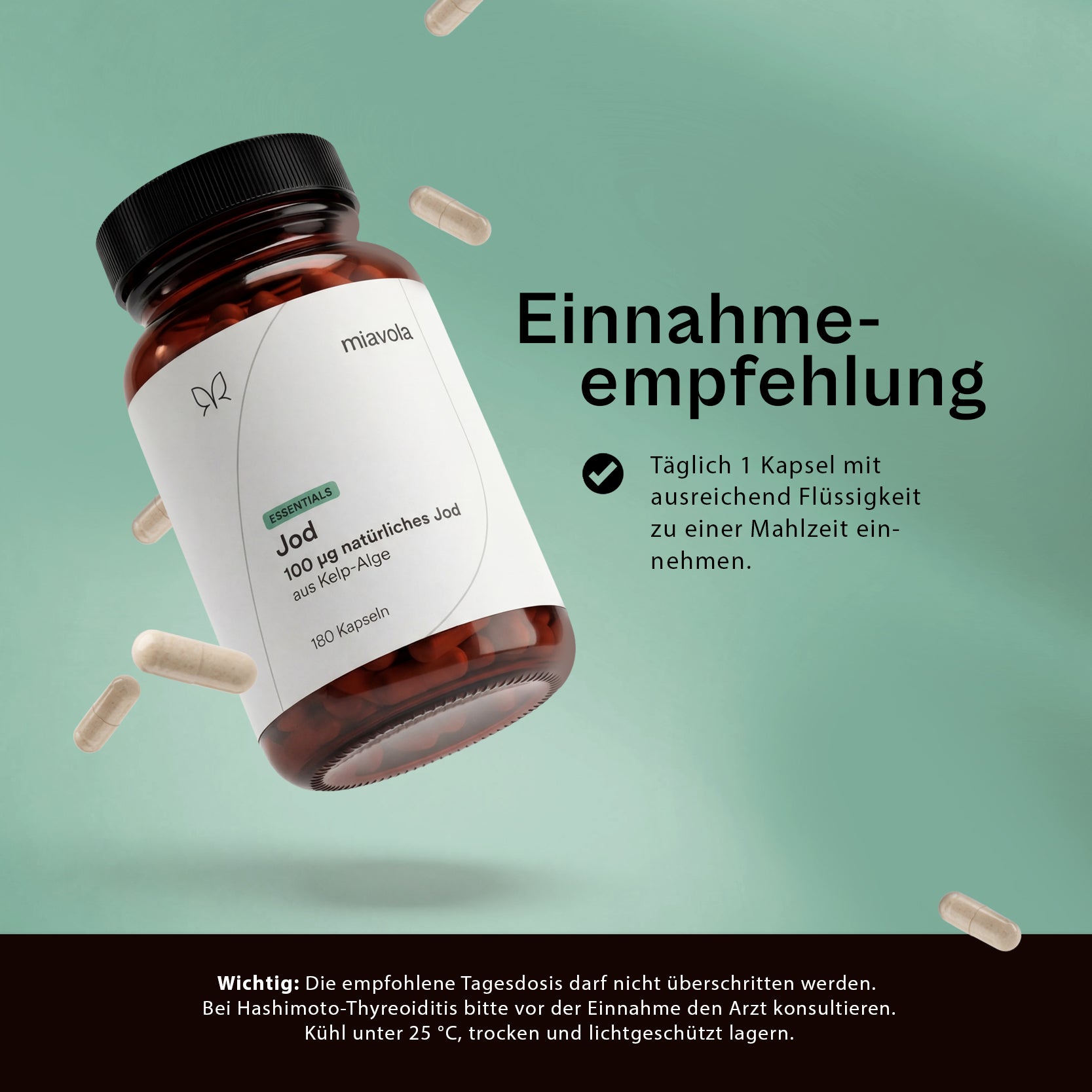 Die empfohlene Tagesdosis darf nicht überschritten werden. Bei Hashimoto-Thyreoiditis bitte vor der Einnahme den Arzt konsultieren. Kühl unter 25 °C, trocken und lichtgeschützt lagern.